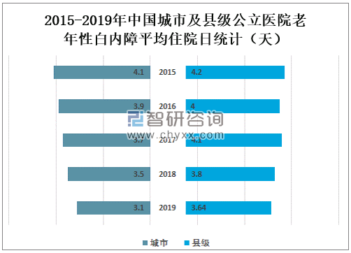 2019年中国城市公立医院老年性白内障平均住院日为3.1天,较2018年减少了0.4天;县级公立医院老年性白内障平均住院日为3.64天,较2018年减少了0.16天。