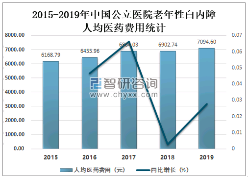 中国公立医院老年性白内障人均医药费用逐年增加,2019年中国公立医院老年性白内障人均医药费用为7094.6元,较2018年增加了191.86元,同比增长2.78%。