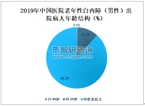 2019年中国医院60岁及以上老年性白内障(男性)出院病人占全国老年性白内障(男性)总出院病人的88.3%,占比最大;45-59岁老年性白内障(男性)出院病人占全国老年性白内障(男性)总出院病人的11.2%;15-44岁老年性白内障(男性)出院病人占全国老年性白内障(男性)总出院病人的0.5%。