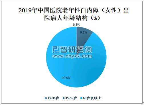 2019年中国医院60岁及以上老年性白内障出院病人占全国老年性白内障总出院病人的89.6%,占比最大;45-59岁老年性白内障出院病人占全国老年性白内障总出院病人的10.0%;15-44岁老年性白内障出院病人占全国老年性白内障总出院病人的0.4%。