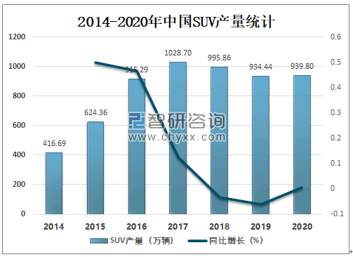 自2018年以来中国SUV产量逐年下滑,2019年中国SUV产量为934.44万辆,较2018年减少了61.41万辆,2020年中国有所回升,2020年中国SUV产量为939.8万辆,较2019年增加了5.36万辆,同比增长0.57%。SUV的发展虽然经历了高低起伏的几个阶段,但作为汽车市场重要的一支力量,SUV市场竞争尚未充分,无论是从产品自身还是厂家对市场的开发,市场容量还远未到达极限,依然有很大的提升空间。