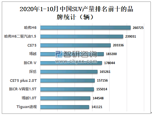 智研咨询发布的《2021-2027年中国SUV行业市场全景调查及发展趋势研究报告》数据显示:2020年1-10月哈弗H6产量为260725辆,全国排名第一;哈弗H6二驱汽油1.5产量为239031辆,全国排名第二;CS75产量为203336辆,全国排名第三。