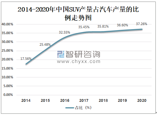 自2014年以来中国SUV产量占汽车产量的比例逐年攀升,2017年增速有所放缓,但依然保持增长趋势,2020年中国SUV产量占汽车产量的37.26%,较2019年增长了0.65%。