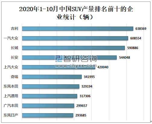 2020年1-10月中国SUV产量排名前十的企业有吉利汽车、一汽大众、长城汽车、长安汽车、上汽大众、奇瑞汽车、东风本田、上汽通用、广汽本田、东风日产。