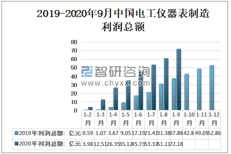 从利润总额来看,2019年1-9月中国电工仪器表制造利润总额37.88亿元;2020年1-9月中国电工仪器表制造利润总额72.18亿元,比上年同期增长34.3亿元。