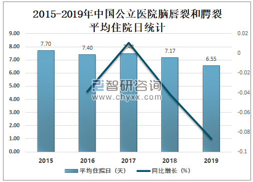 2015-2019年中国公立医院脑唇裂和腭裂平均住院日统计