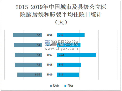 2019年中国城市公立医院脑唇裂和腭裂平均住院日为6.59天,较2018年减少了0.6天;县级公立医院脑唇裂和腭裂平均住院日为5.8天,较2018年减少了0.6天。