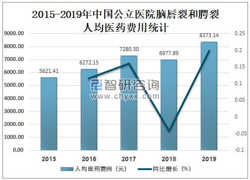 2019年中国公立医院脑唇裂和腭裂人均医药费用达8373.14元,较2018年增加了1395.25元,同比增长20.00%。