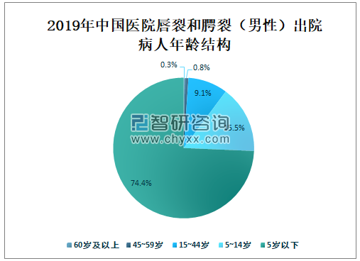2019年中国医院5岁以下唇裂和腭裂(男性)出院病人占全国唇裂和腭裂(男性)总出院病人的74.4%,占比最大;5~14岁唇裂和腭裂(男性)出院病人占全国唇裂和腭裂(男性)总出院病人的15.5%;15~44岁唇裂和腭裂(男性)出院病人占全国唇裂和腭裂(男性)总出院病人的9.1%;45~59岁唇裂和腭裂(男性)出院病人占全国唇裂和腭裂(男性)总出院病人的0.8%;60岁及以上唇裂和腭裂(男性)出院病人占全国唇裂和腭裂(男性)总出院病人的0.3%。