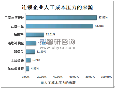 我国连锁企业人工成本压力主要来源于工资增长、五险一金的缴纳,分别占比87.83%、83.48%,其余加班费、离职补偿金、残保金占比均在10%以上。