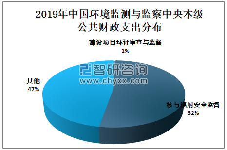 2019年中国环境监测与监察中央本级公共财政支出8.4亿元,其中:建设项目环评审查与监督中央本级公共财政支出0.04亿元,占1%;核与辐射安全监督中央本级公共财政支出4.39亿元,占52%;其他中央本级公共财政支出3.97亿元,占47%。