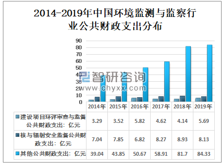 2019年中国环境监测与监察行业公共财政支出98.15亿元,其中:建设项目环评审查与监督公共财政支出5.69亿元,核与辐射安全监督公共财政支出8.13亿元,其他公共财政支出84.33亿元。