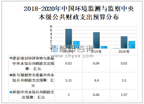2020年中国环境监测与监察中央本级公共财政支出预算5.29亿元,其中:建设项目环评审查与监督中央本级公共财政支出预算0.02亿元,核与辐射安全监督中央本级公共财政支出预算3.3亿元,其他中央本级公共财政支出预算1.97亿元。