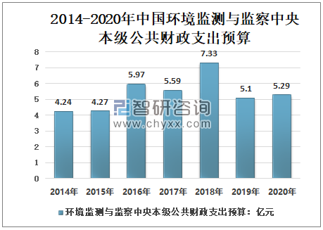 2018年中国环境监测与监察中央本级公共财政支出预算7.33亿元,为2014年来环境监测与监察中央本级公共财政支出最高预算;2019年中国环境监测与监察中央本级公共财政支出预算5.1亿元,比上年减少2.23亿元;2020年中国环境监测与监察中央本级公共财政支出预算5.29亿元,比上年增加0.19亿元。