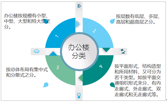 办公楼指机关、企业、事业单位行政管理人员,业务技术人员等办公的业务用房,现代办公楼正向综合化、一体化方向发展。办公楼按规模有小型、中型、大型和特大型之分。按层数有低层、多层、高层和超高层之分。按总体布局有集中式和分散式之分。此外,按平面形式、结构造型和所用材料,又可分为若干类型。如按平面交通组织形式来分,有内走廊式、外走廊式、双走廊式和无走廊式(大空间灵活隔断)等。