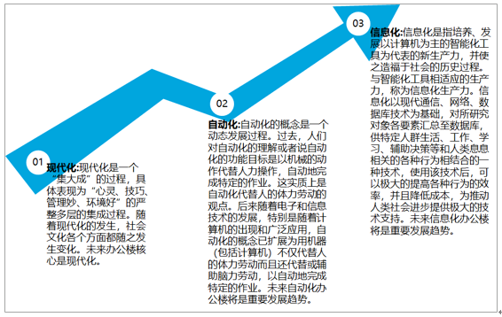 城市中心区的办公楼仍将向高层和超高层发展,并出现办公单元的布局形式。办公室的装备趋向现代化、自动化、信息化。为满足大量办公人员生活需要,开放型中庭和低层对外服务裙房的布局正被广泛采用。提高室内外环境质量、办公效率和办公室的技术设施水平,满足多种功能需要,也是办公楼建筑探索的课题。
