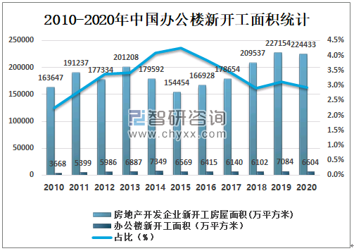 智研咨询发布的《2021-2027年中国办公楼行业市场发展调研及发展趋势预测报告》数据显示:自2015年开始中国办公楼新开工面积开始下滑,2019年短暂回升后,2020年较2019年有所下滑,2020年中国办公楼新开工面积为6604万平方米,较2019年减少了480万平方米,占房地产行业总新开工面积的2.9%。