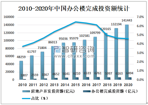 自2010以来中国办公楼完成投资额持续增长,2018年开始下滑,2019年开始恢复增长,2020年中国办公楼投资额完成6494亿元,较2019年增加了331亿元,占房地产行业总投资额的4.6%,预计未来将继续保持增长。