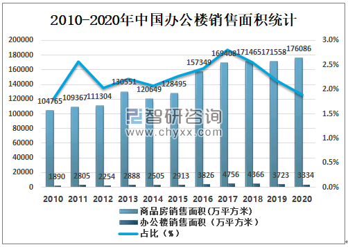 2018年开始中国办公楼销售面积开始减少,2020年中国办公楼销售面积为3334万平方米,较2019年减少了389万平方米,占房地产行业总销售面积的1.9%。