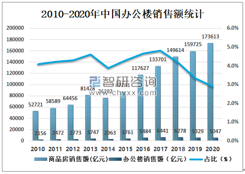 随着中国办公楼销售面积的减少,销售额也在减少,2020年中国办公楼销售额为5047亿元,较2019年减少了282亿元,占房地产行业总销售额的2.9%。