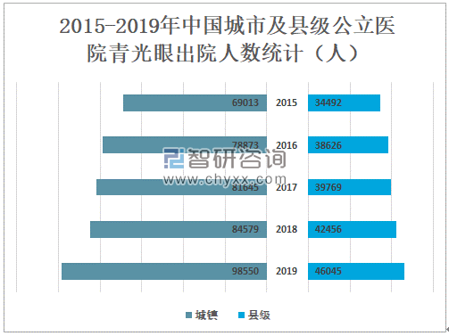 2019年中国城镇公立医院青光眼出院人数为98550人,较2018年增加了13971人;县级公立医院青光眼出院人数为46045人,较2018年增加了3589人。