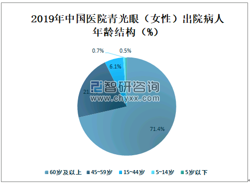 2019年中国60岁及以上青光眼病人占全国青光眼总出院病人的65.7%,占比最大;45~59岁青光眼病人占全国青光眼总出院病人的23.0%;15~44岁青光眼病人占全国青光眼总出院病人的9.6%;5~14岁青光眼病人占全国青光眼总出院病人的1.0%;5岁以下青光眼病人占全国青光眼总出院病人的0.6%。