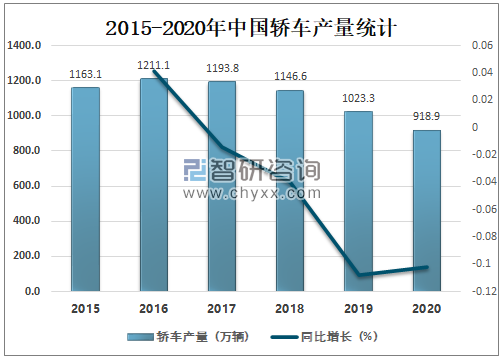 近年来,我国国民经济的飞速稳定发展,使得我国居民的生活水平有了很大的改善,对住房和车子消费需求增加,车子已经成为生活中不可或缺的生活资料和生产资料。但自2017年起中国轿车产量逐年下滑,2020年中国轿车产量为918.9万辆,较2019年减少了104.39万辆,同比减少10.20%。