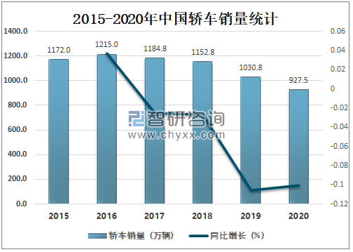 自2017年起中国轿车销量开始下滑,2020年中国轿车销量为927.5万辆,较2019年减少了103.26万辆,同比减少10.02%。