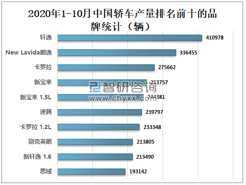 2020年1-10月轩逸轿车产量为410978辆,全国排名第一;NewLavida朗逸轿车产量为336455辆,全国排名第二;卡罗拉轿车产量为275662辆,全国排名第三。