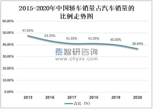 总体来看中国轿车销量占汽车销量的比例呈下滑趋势,2020年中国轿车销量占汽车销量的36.64%,较2019年减少了3.36%。
