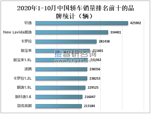 2020年1-10月轩逸轿车销量为425902辆,全国排名第一;NewLavida朗逸轿车销量为334401辆,全国排名第二;卡罗拉轿车销量为281438辆,全国排名第三。