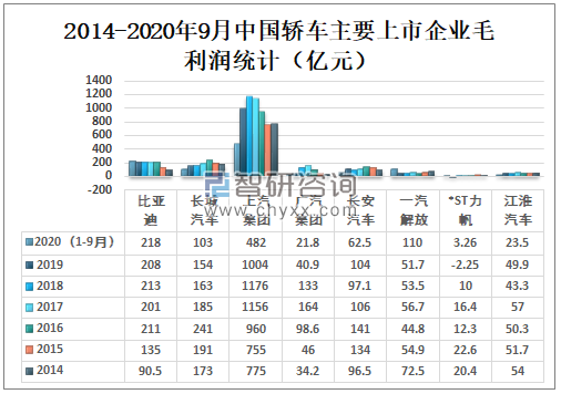 2014-2020年9月中国轿车主要上市企业毛利润统计(亿元)