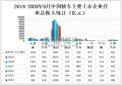 2014-2020年9月中国轿车主要上市企业营业总收入统计(亿元)