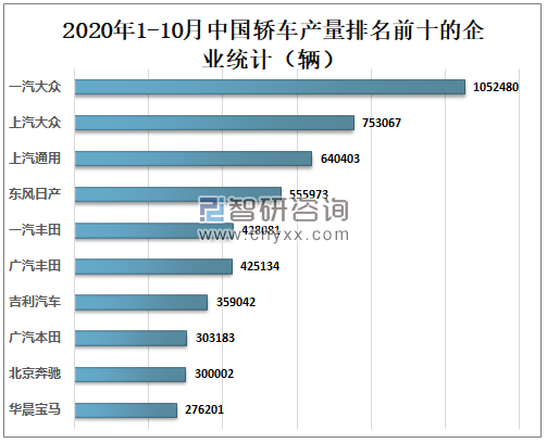 2020年1-10月一汽大众轿车产量为1052480辆,全国排名第一;上汽大众轿车产量为753067辆,全国排名第二;上汽通用轿车产量为640403辆,全国排名第三。