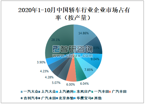 2020年1-10月一汽大众轿车产量占全国轿车总产量的14.86%;上汽大众轿车产量占全国轿车总产量的10.63%;上汽通用轿车产量占全国轿车总产量的9.04%;东风日产轿车产量占全国轿车总产量的7.85%;一汽丰田轿车产量占全国轿车总产量的6.04%;广汽丰田轿车产量占全国轿车总产量的6.00%;吉利汽车轿车产量占全国轿车总产量的5.07%;广汽本田轿车产量占全国轿车总产量的4.28%;北京奔驰轿车产量占全国轿车总产量的4.23%;华晨宝马轿车产量占全国轿车总产量的3.90%。2020年1-10月一汽大众、上汽大众、上汽通用、东风日产、一汽丰田、广汽丰田、吉利汽车、广汽本田、北京奔驰、华晨宝马十家上市企业轿车产量总和占全国轿车总产量的71.9%,企业市场占有率较高,行业集中度较高。
