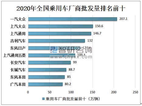 2020年我国乘用车市场销量超过了预期,行业在连续两年下降后的稳步回升态势。2020年我国广义乘用车批发销量排名前十的分别是一汽大众、上汽大众、上汽通用、吉利汽车、东风日产、上汽通用五菱、长安汽车、长城汽车、东风本田、广汽本田,其中排名前三的一汽大众、上汽大众和上汽通用批发量分别是207.1、150.6、146.7万辆。