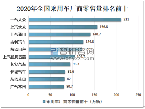 2020年全国乘用车厂商零售量排名前十