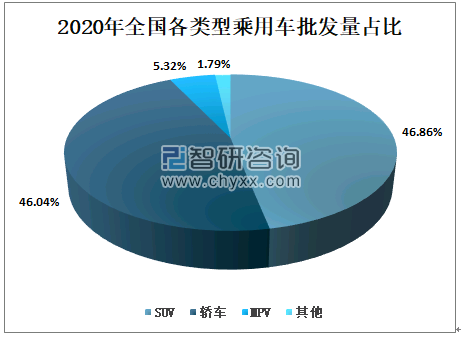 我国乘用车下细分为基本型乘用车(轿车)、多用途车(MPV)、运动型多用途车(SUV)等,其中2020年全国SUV批发量为943万辆,占乘用车批发量的46.86%,轿车批发量为927万辆,占乘用车批发量的46.04%,MPV批发量为107万辆,占乘用车批发量的5.32%。