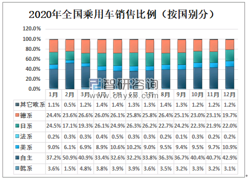 2020年全国乘用车销售比例(按国别分)