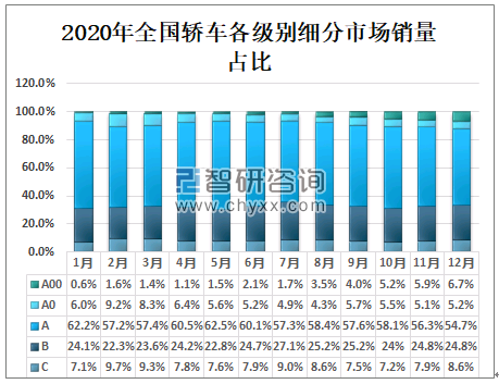 2020年全国轿车各级别细分市场销量占比