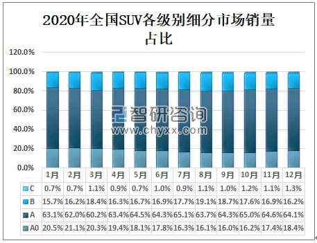我国SUV按照级别分为A0、A、B、C级车,其中A级车市场销量占比最高,平均达63.7%,其次B级车、A0级车平均占比分别是17.2%、18.1%,C级车占比最小,仅有1.0%。