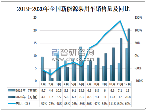 2019-2020年全国新能源乘用车销售量及同比