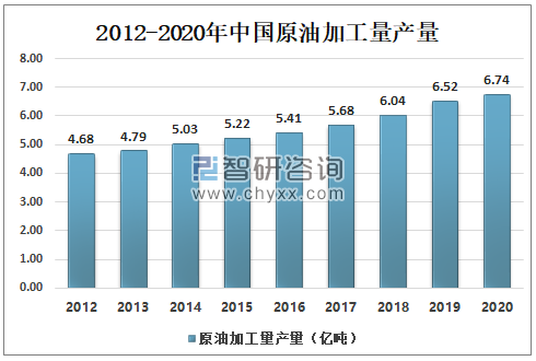 自上个世纪末以来,中国原油加工能力不断提高,原油加工量也不断增加,2020年中国原油加工量产量达到6.74亿吨,较2019年增加了0.22亿吨。