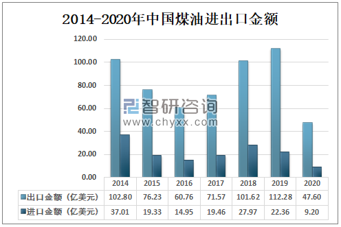 2019年中国煤油出口金额为112.28亿美元,进口金额为22.36亿美元;2020年中国煤油出口金额为47.60亿美元,进口金额为9.20亿美元。