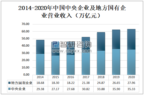 2014-2020年中国中央企业及地方国有企业营业收入(万亿元)