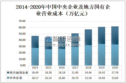 2020年中国中央企业营业成本的33.69万亿元,占国有企业总营业成本的54.81%;地方国有企业营业成本为27.78万亿元,占国有企业总营业成本的45.19%。