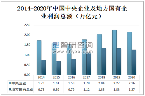 其中中央企业利润总额为2.16万亿元,较2019年减少了0.11万亿元,占国有企业利润总额的62.99%;地方国有企业利润总额为1.27万亿元,较2019年减少了0.06万亿元,占国有企业利润总额的37.01%