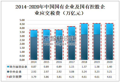 2020年中国国有企业及国有控股企业应交税费4.61万亿元,其中中央企业应交税费3.21万亿元,地方国有企业应交税费1.40万亿元。