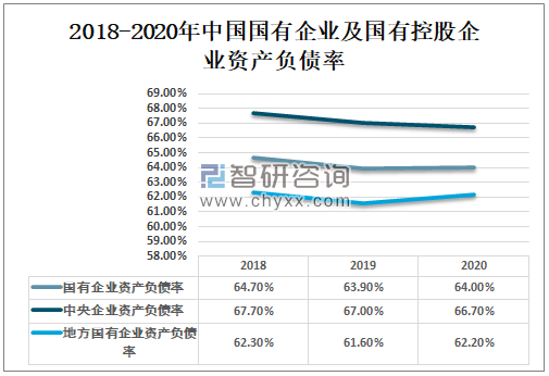 2020年中国国有企业及国有控股企业资产负债率为64%,其中中央企业资产负债率为66.70%,地方国有企业资产负债率为62.20%。