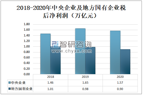 智研咨询发布的《2021-2027年中国国企改革行业供需态势分析及投资机会分析报告》数据显示:2019年中国中央企业税后净利润为1.65万亿元,地方国有企业税后净利润为0.98万亿元;2020年中国中央企业税后净利润为1.57万亿元,地方国有企业税后净利润为0.90万亿元。
